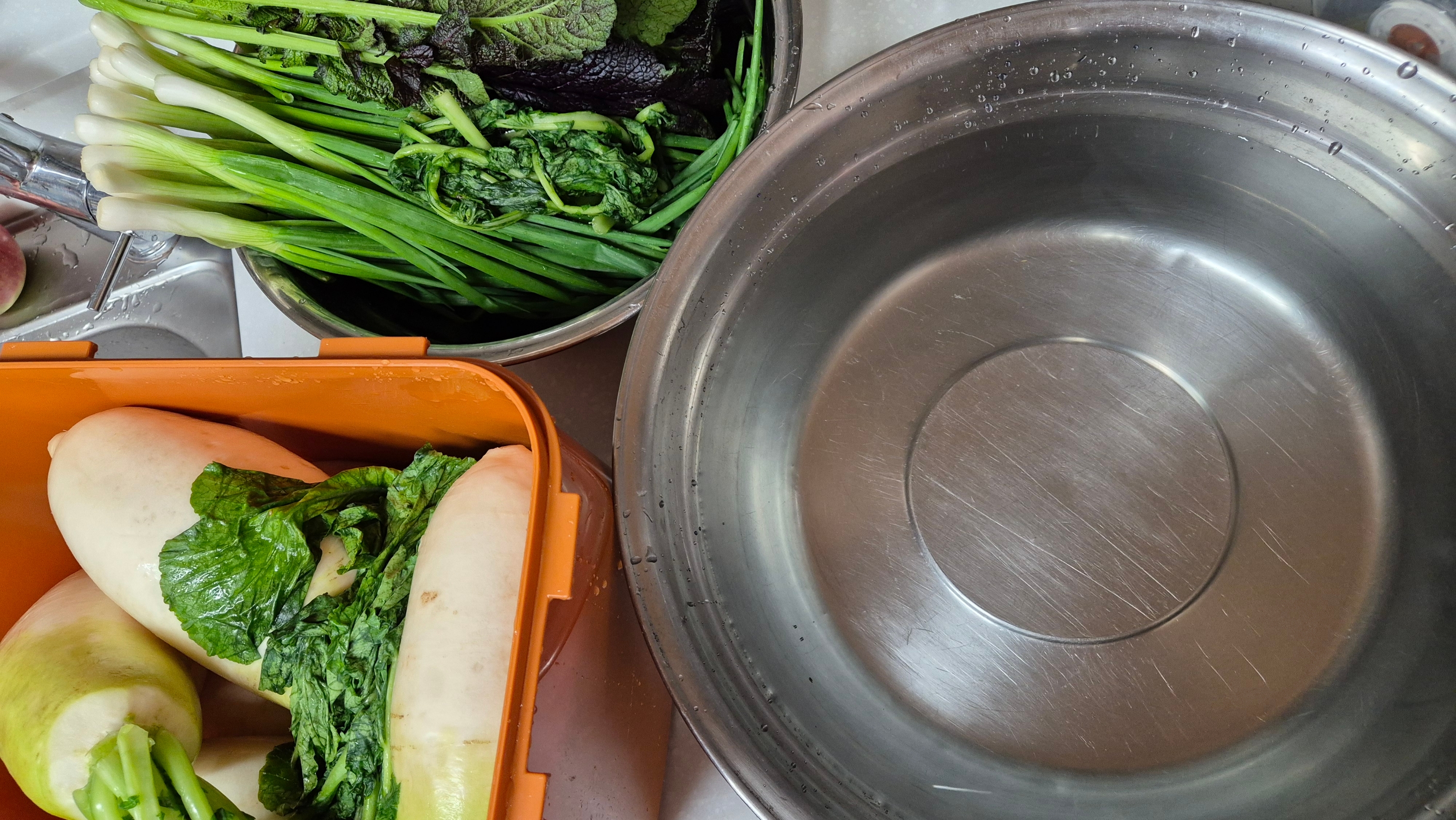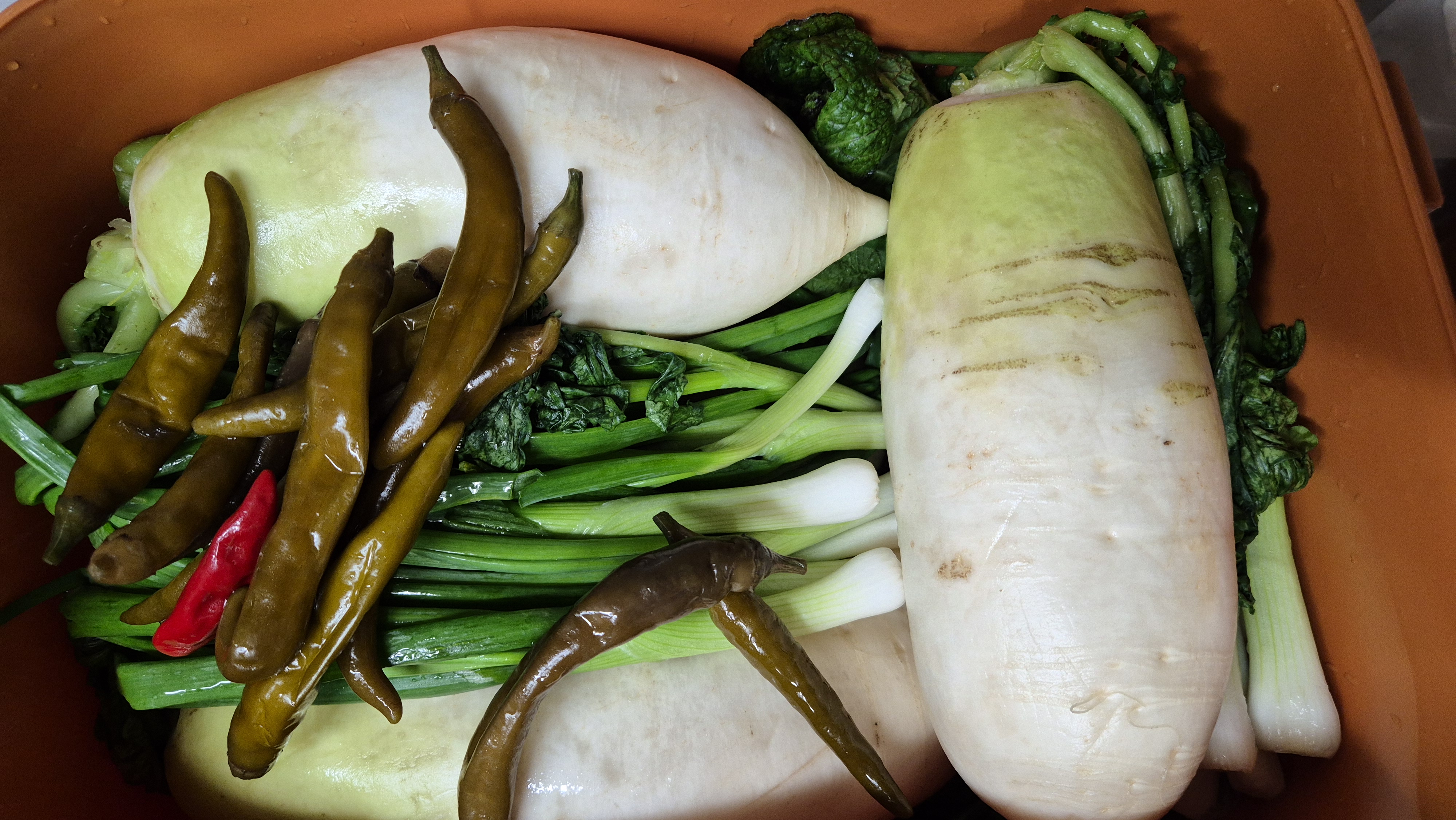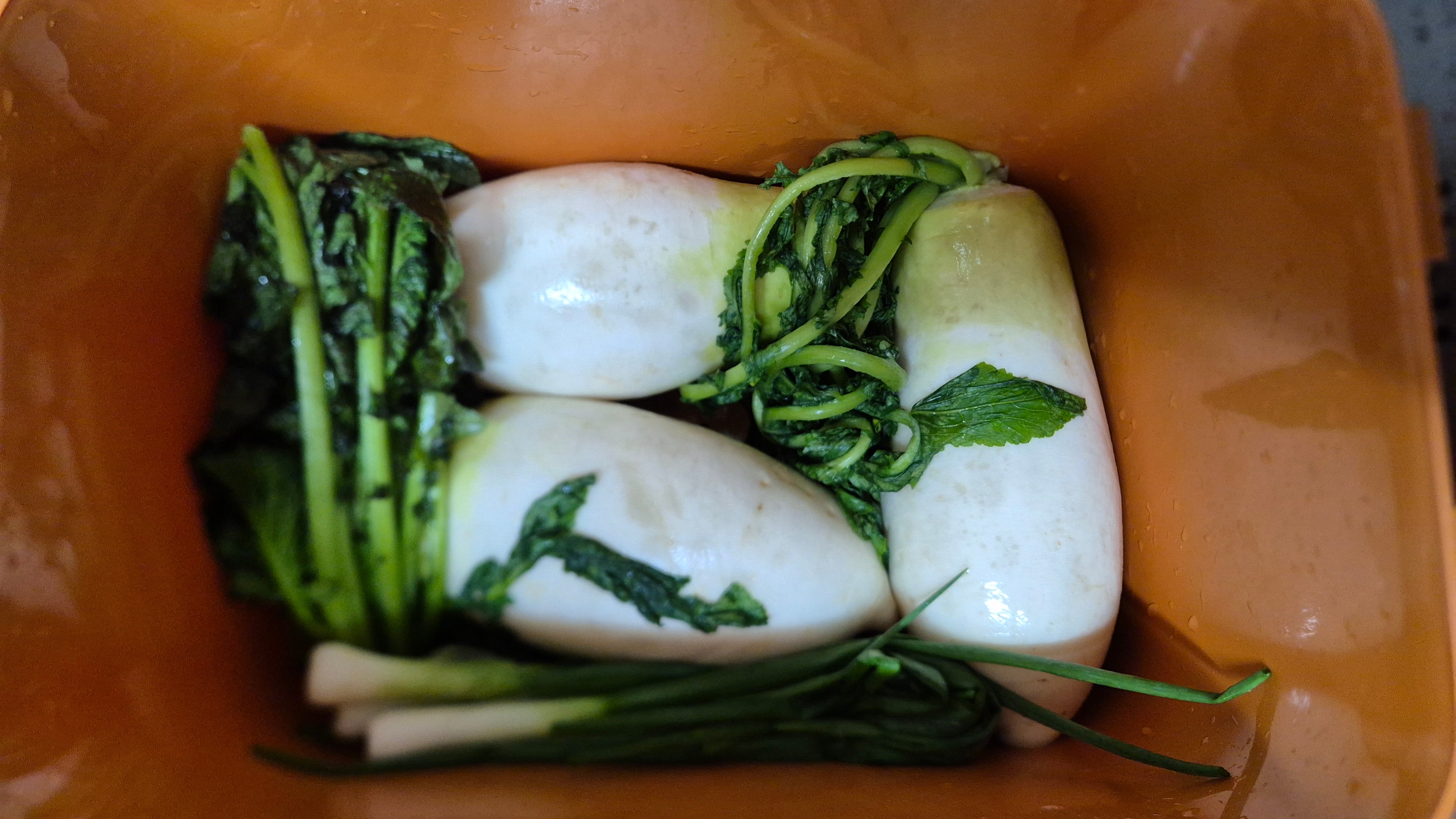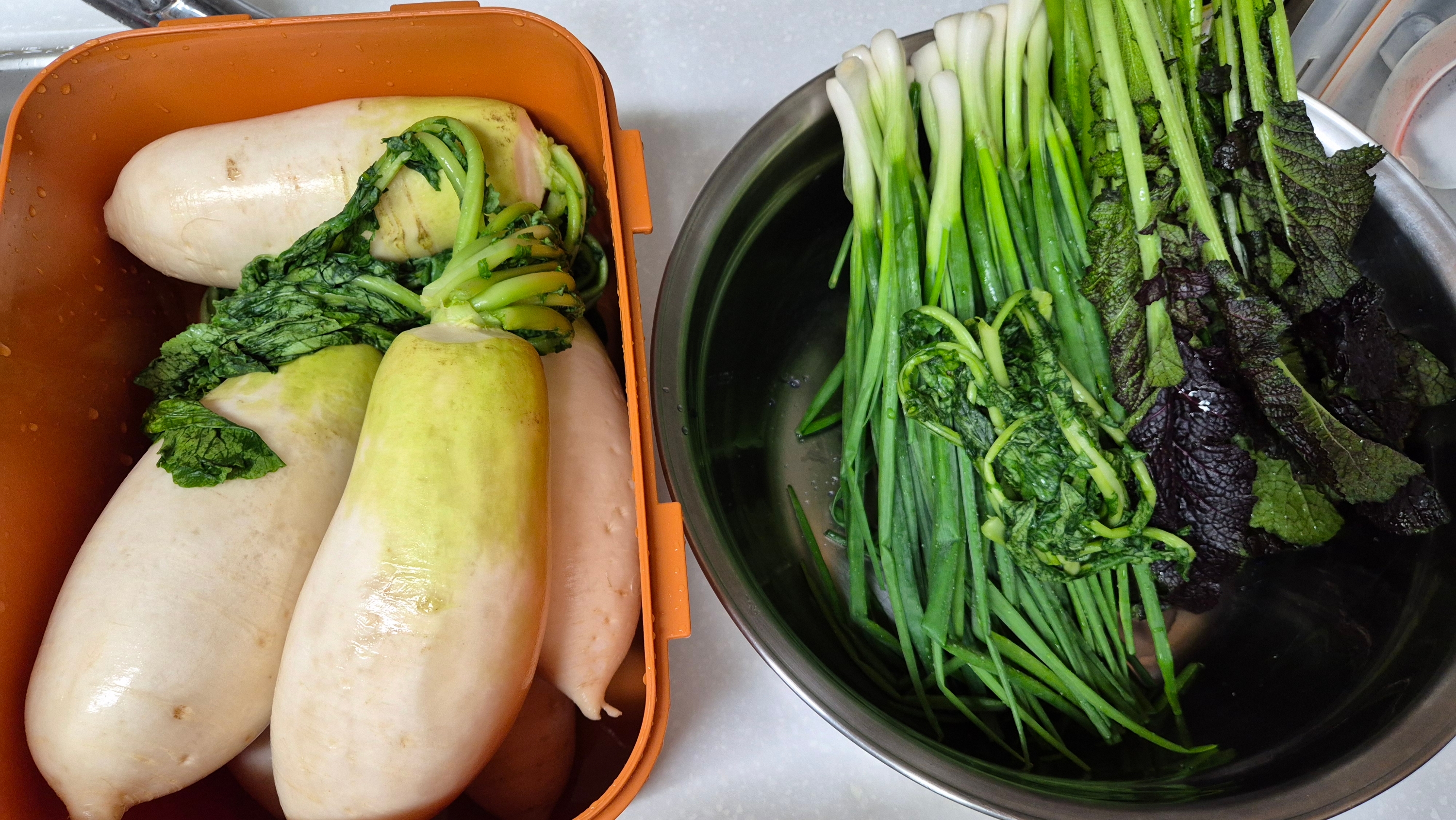 동치미에 쪽파랑 홍갓을 같이 넣어 먹으니