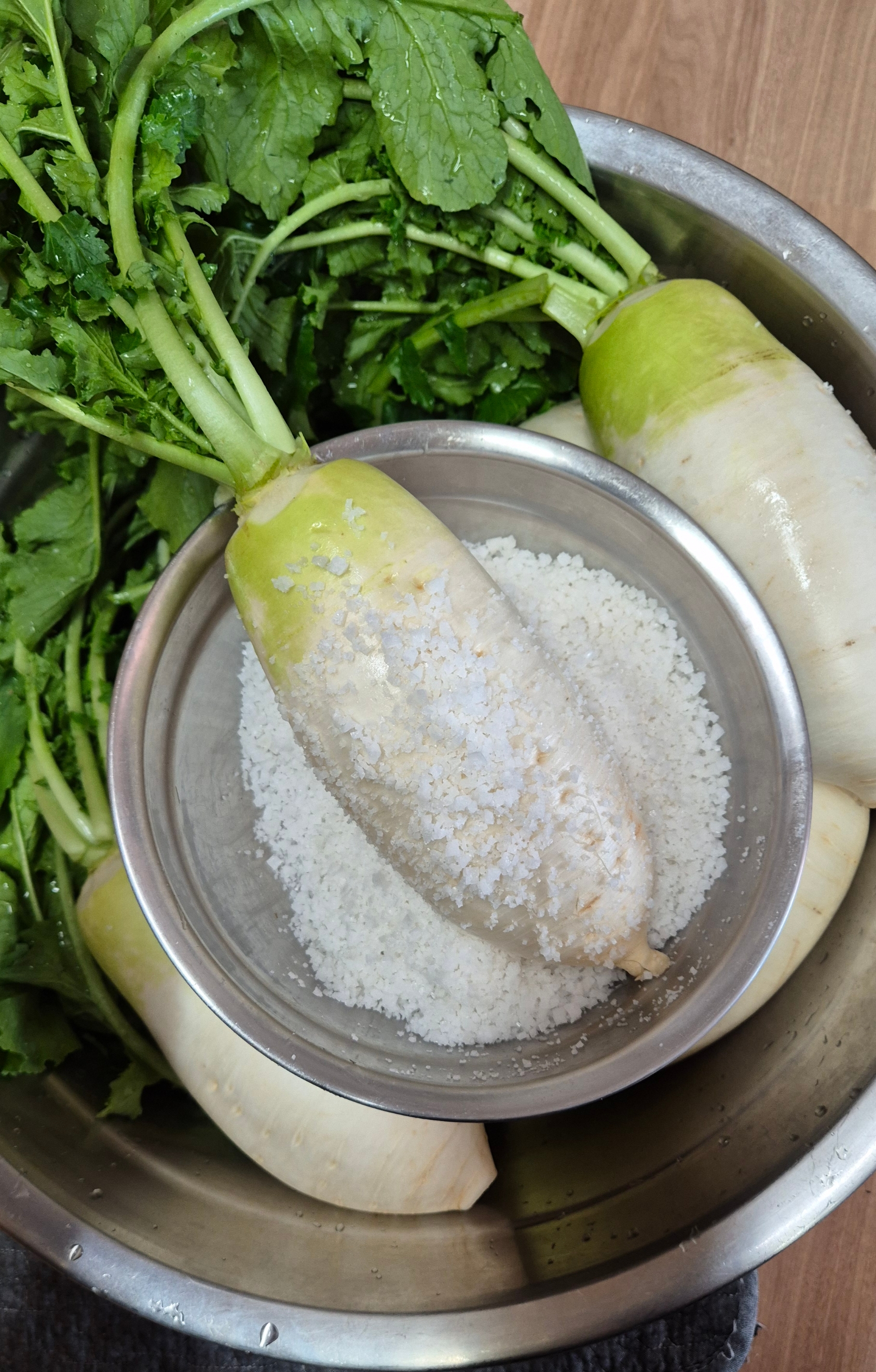 무를 돌돌 굴려 소금에 절여주고